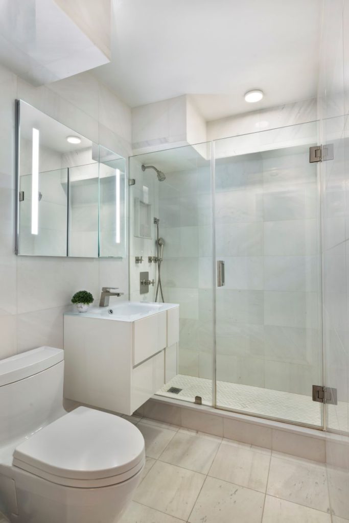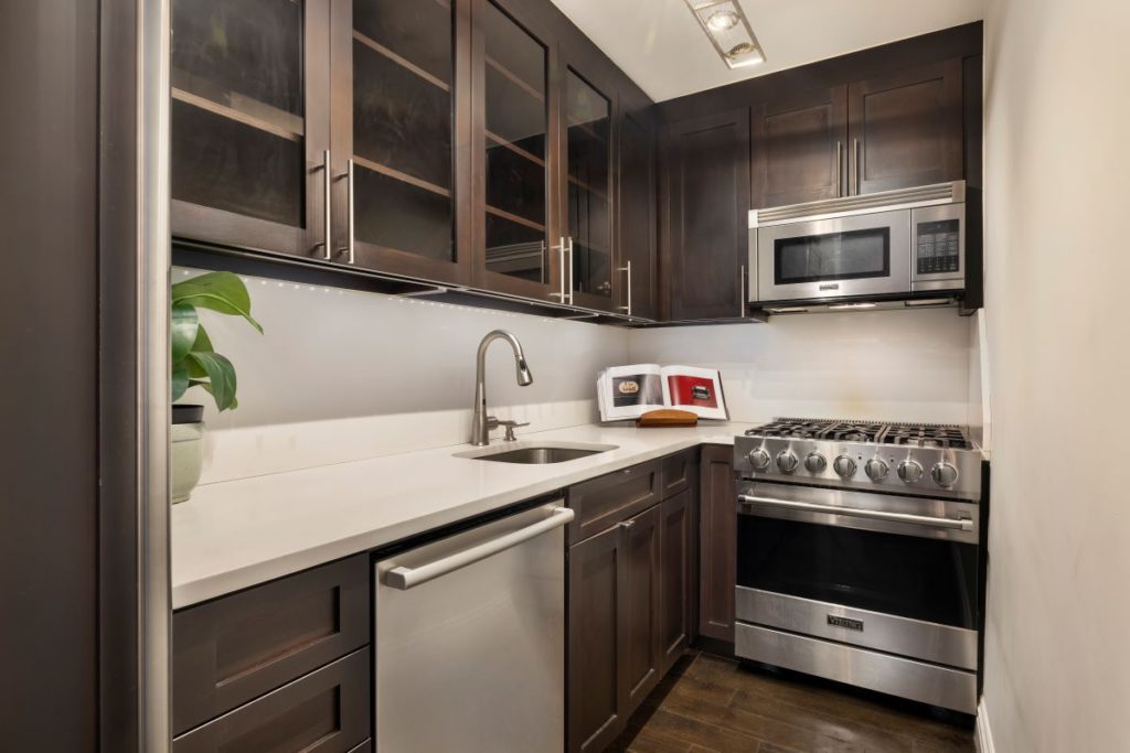 This thoughtfully renovated home boasts handsome, walnut-stained, plank hardwood floors, a spectacular open galley kitchen with quartz countertops, a Subzero built-in refrigerator, a Viking stove with 5 burners and a Bosch dishwasher. The kitchen flows seamlessly into the living room area, with plenty of room for a large dining table, perfect for entertaining. The roomy bedroom comfortably accommodates a king-size bed, and the beautifully renovated bathroom includes exquisite white natural marble, a Toto toilet, a Porcelanosa sink, Robern LED lit wall mirror cabinet and an elegant, frameless glass shower enclosure.